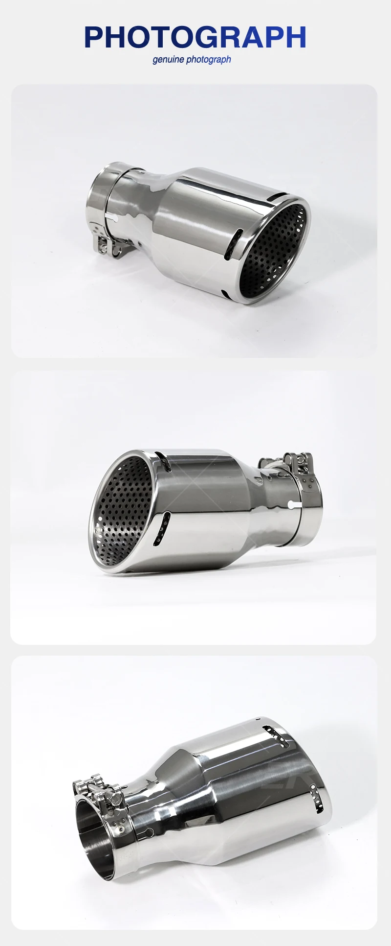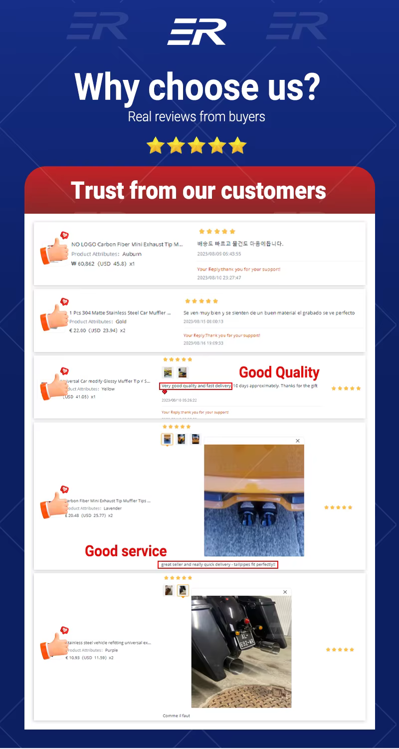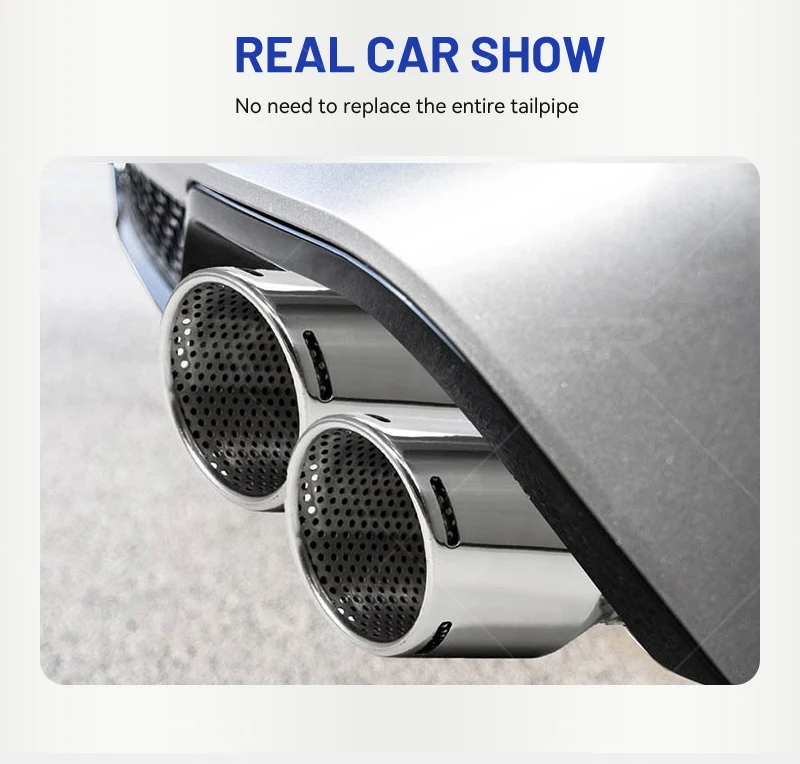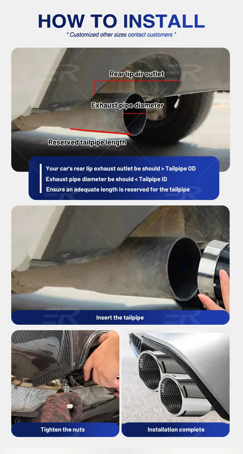 Se recomienda la instalación profesional. soldar a silenciadores de stock o del mercado de accesorios. Verifique el parachoques/valancia/difusor trasero para conocer el ajuste, es posible que se necesiten ajustes o que sea necesario reemplazarlos para adaptarse a puntas de estilo más amplio.