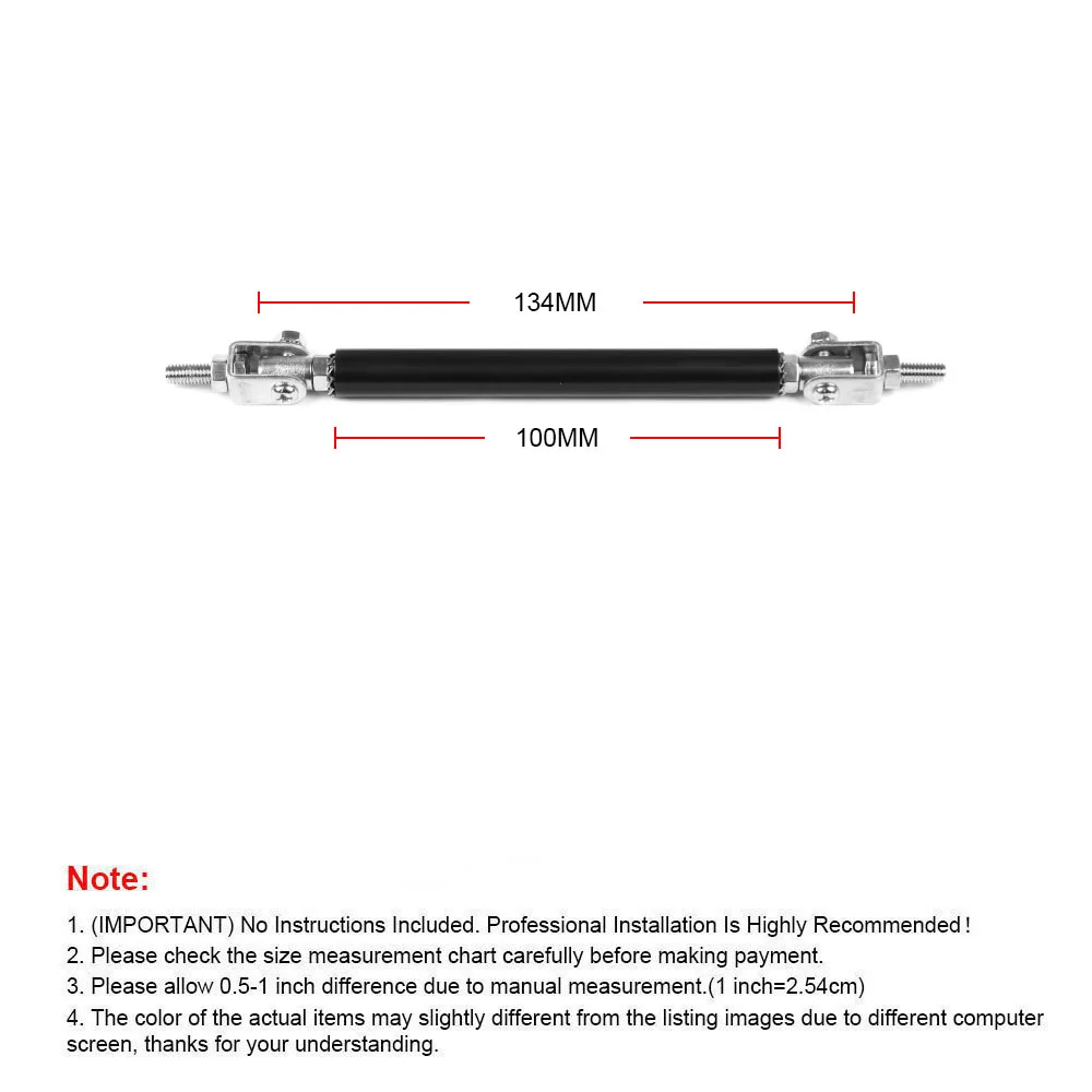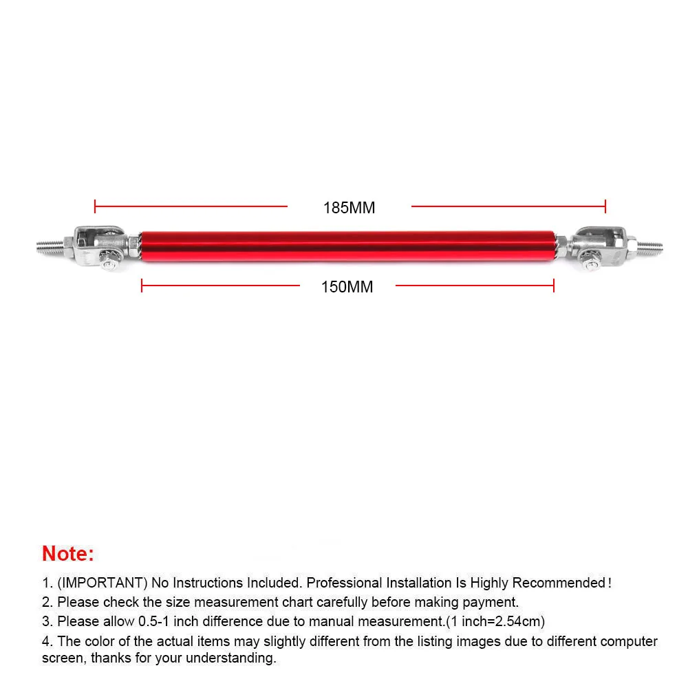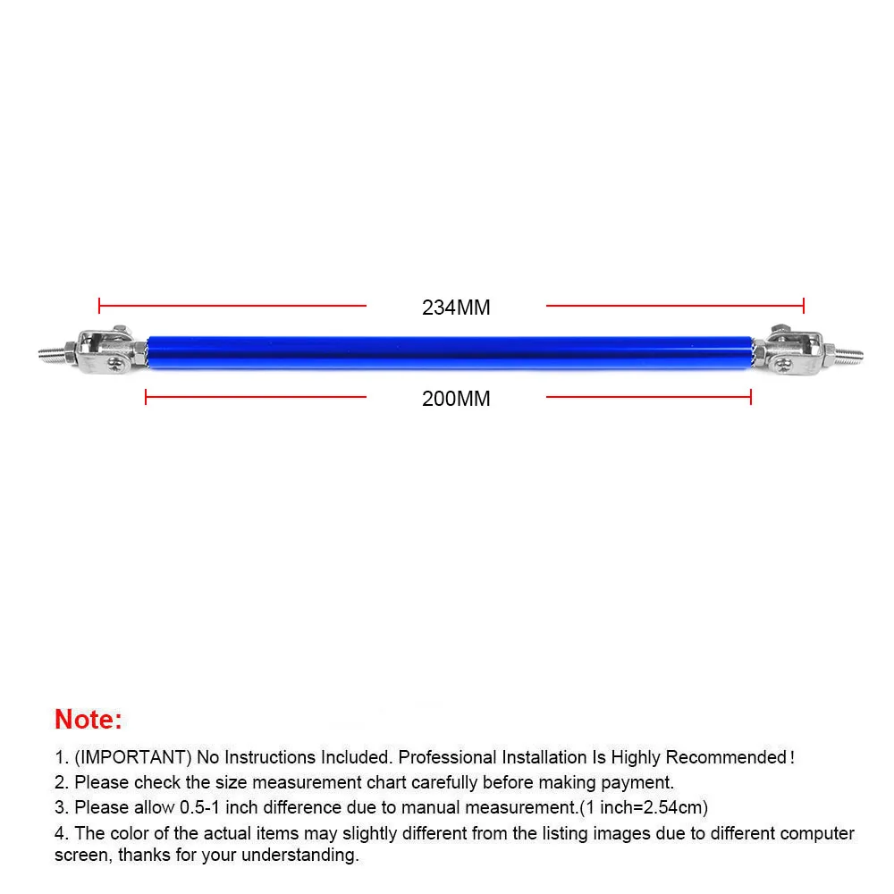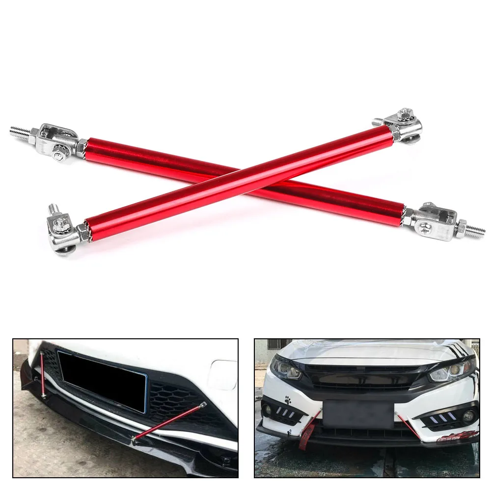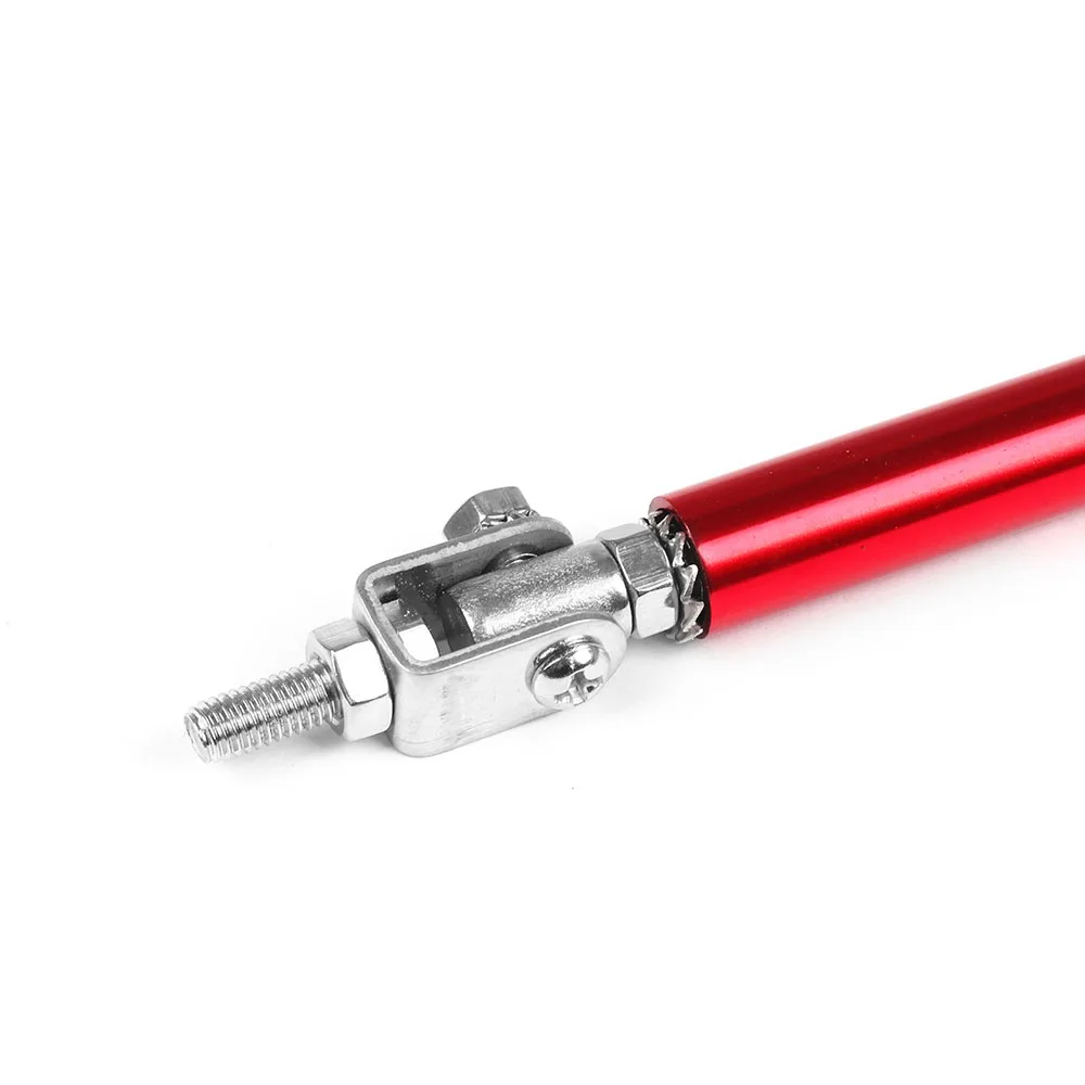 Estas varillas de soporte se utilizan para reforzar su divisor delantero o difusor trasero. Viene con un par de varillas de soporte de acero inoxidable. Las barras de dirección ajustables de acero inoxidable especialmente diseñadas (también conocidas como varillas divisoras delanteras) se utilizan comúnmente para reforzar/soportar paneles divisores delanteros o difusores traseros. Estos incluyen juntas superior e inferior totalmente articuladas que permiten su instalación en cualquier ángulo. El producto requerirá perforar agujeros en el parachoques y/o el labio/difusor para fijarlo de forma segura al vehículo. Nuevo aspecto exterior, puede decorar tu coche.