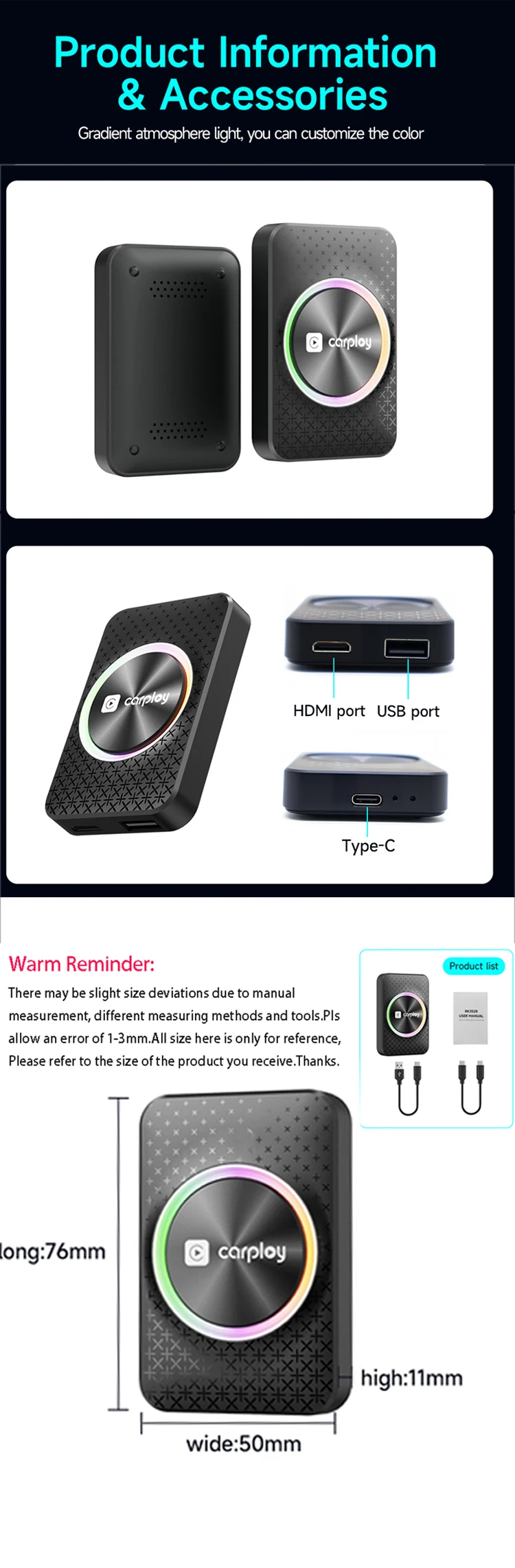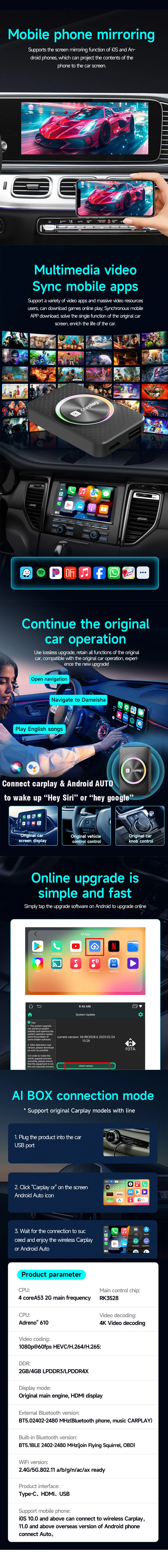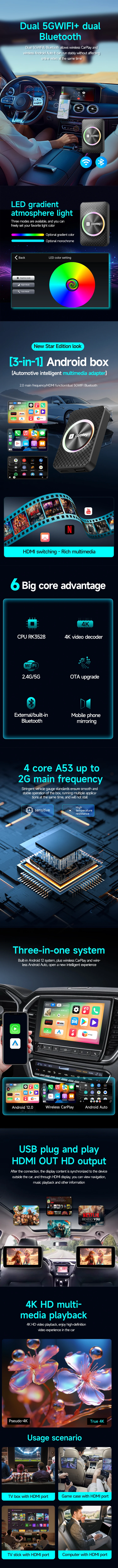 3 en 1 Carplay Android 12 HDMI TV Box Carplay inalámbrico Android Auto Smart Ai Box RK3528 4K HD compatible con salida HDMI con luz LED