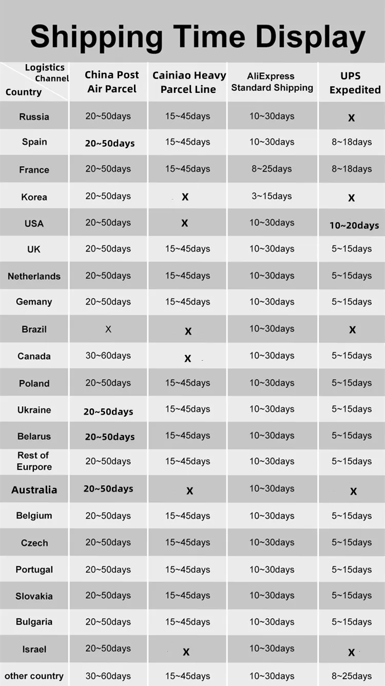 Queridos amigos americanos/Canadá. El paquete se puede entregar entre 20 y 25 días después del envío. Sin embargo, debido a razones técnicas de la plataforma AliExpress, es posible que solo muestre información que el comerciante ha enviado, la información de logística no se puede actualizar en tiempo real. Pero no te preocupes, el paquete eventualmente llegará. Si desea conocer la información logística más reciente, puede intentar verificarla en este sitio web: https://t.17track.net/zh-cn, ingrese su número de seguimiento o puede comunicarse con nuestro servicio de atención al cliente para realizar una consulta por usted. Por cierto, si no puede aceptar este Tiempo de logística, no realice un pedido, gracias por su cooperación y comprensión. ¡Que tenga un lindo día!