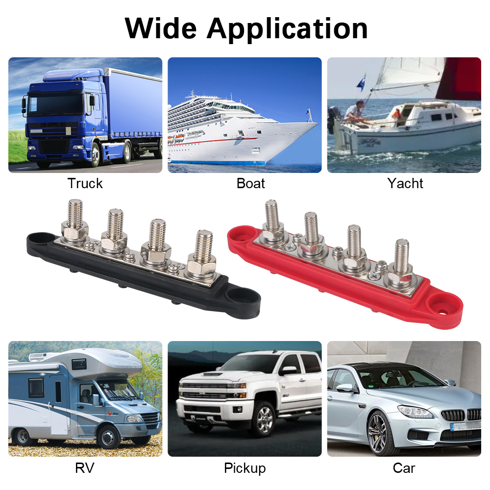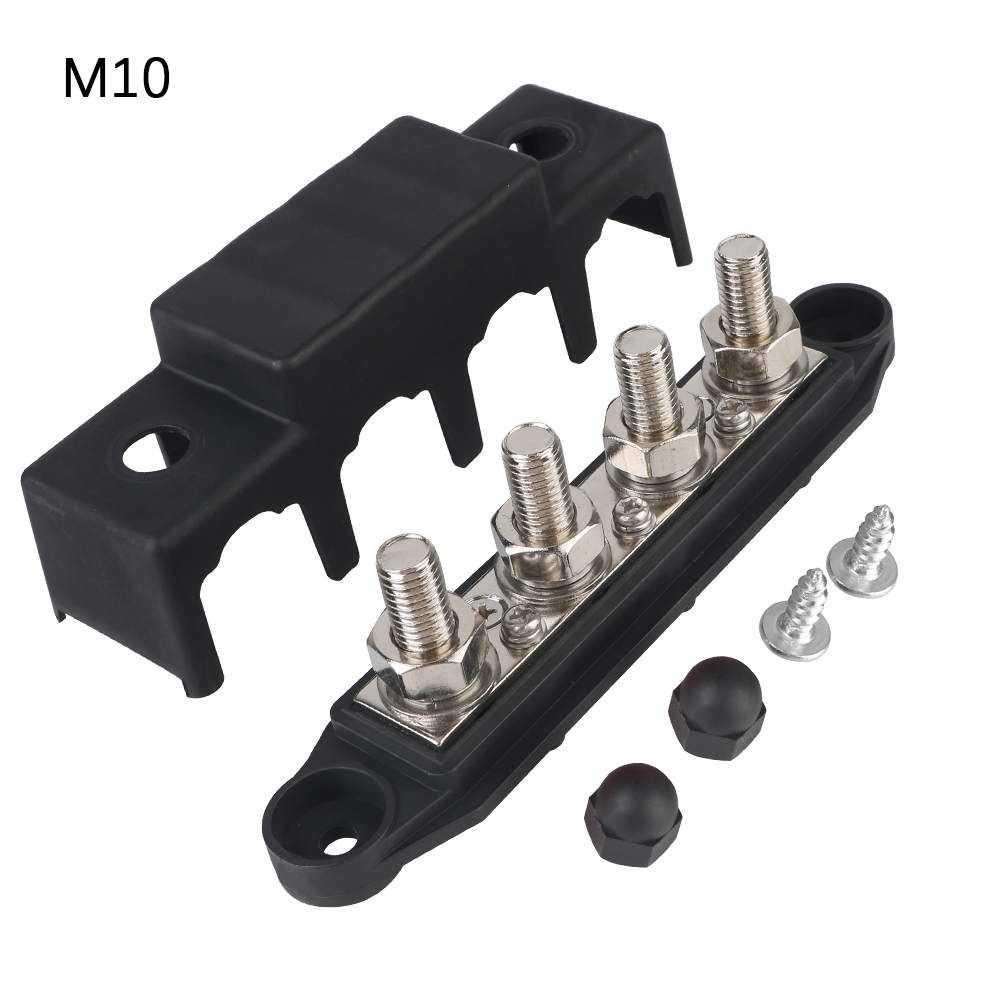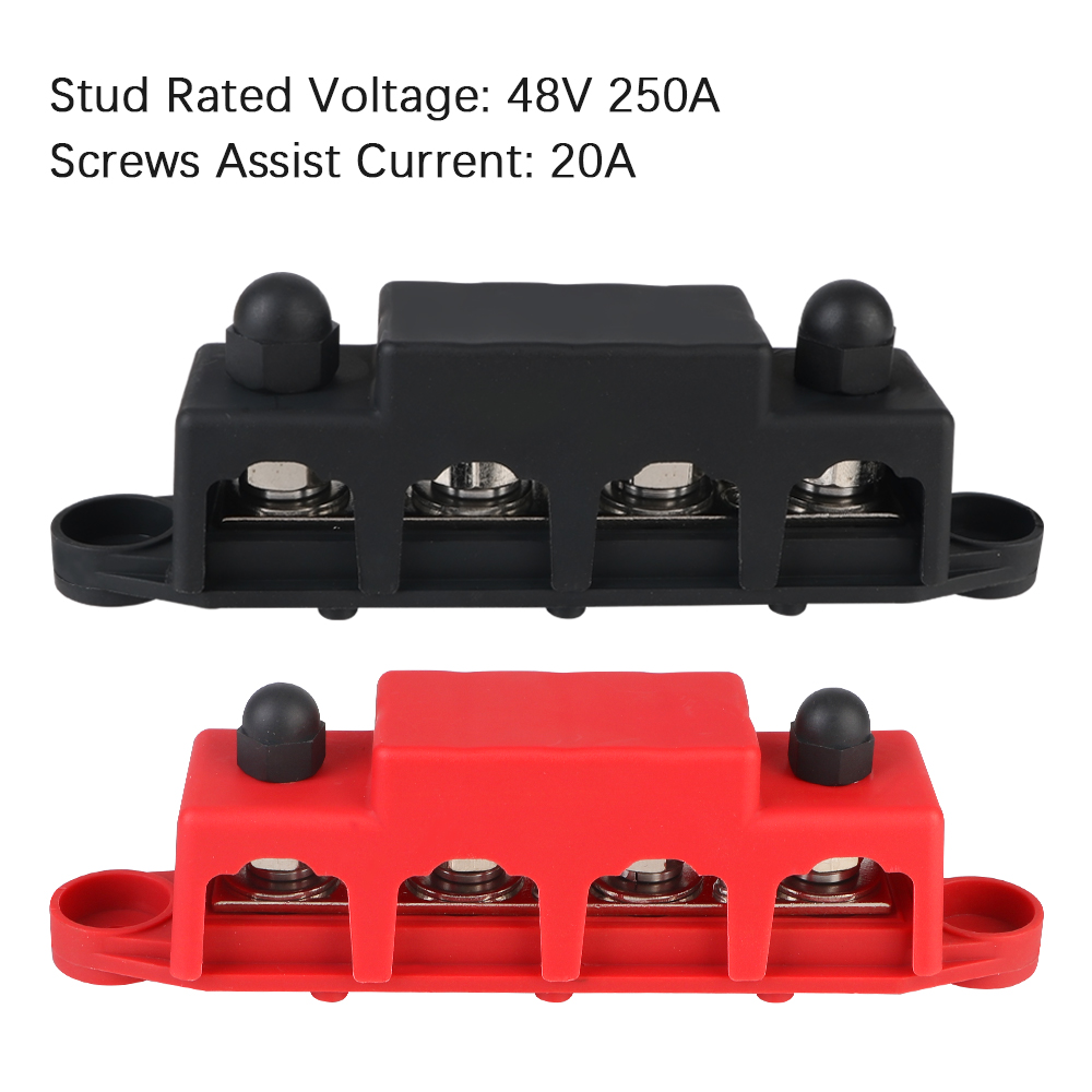 El bloque de distribución de energía 5/16 "3/8" pernos M8 M10 con 4 vías y capacidad para 48V 250A DC es una solución ideal para la electrónica en vehículos como barcos, camiones, RV, caravanas y coches. Diseñado para ser universal y resistente a cortocircuitos, este dispositivo permite la unión segura de múltiples cables dentro del vehículo o del barco.