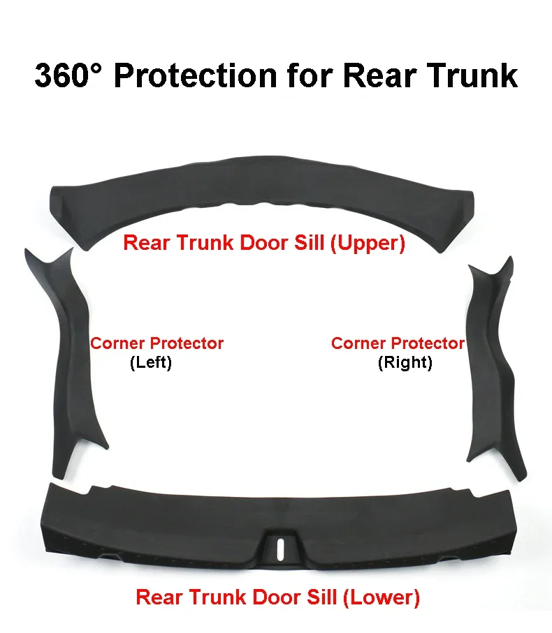 Alféizar protector TPE suave del maletero trasero. Apto para Tesla modelo 3 Highland 2024. Material: TPE suave. Umbral de la puerta del maletero trasero (superior) y alféizar de la puerta del maletero trasero (inferior). Protector de esquina del maletero trasero.