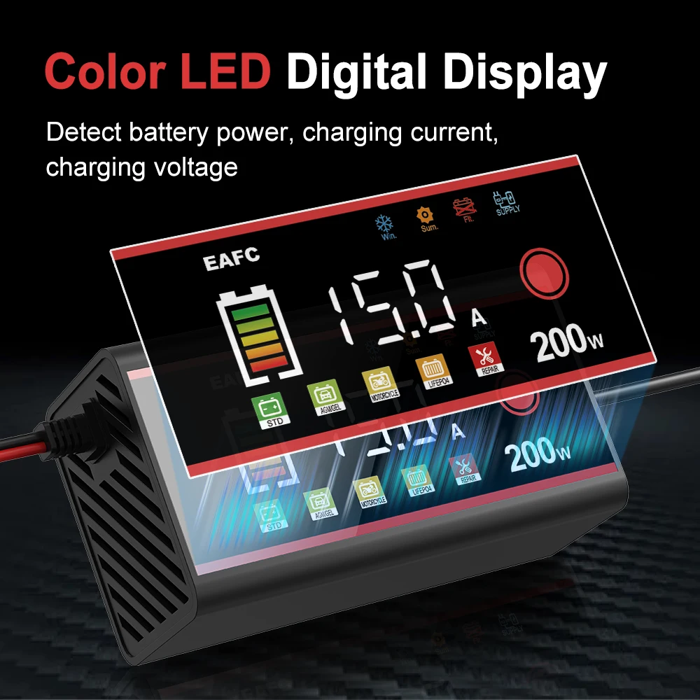 El EAFC-cargador ofrece una potencia de carga máxima de 200W/100W, lo que permite cargar rápidamente las baterías más grandes sin preocupaciones. Su capacidad para manejar baterías desde 4Ah hasta 200Ah lo convierte en una opción versátil tanto para vehículos de alta potencia como para aquellos con baterías de menor tamaño.