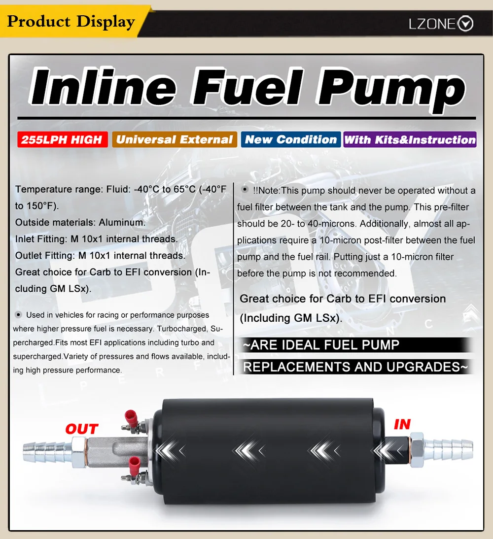 La LZONE RACING - New Universal High Flow & Pressure External Inline 255LPH Fuel Pump GSL392 es una opción ideal para aquellos que buscan mejorar el rendimiento de su vehículo. Este sistema se ajusta a todos los vehículos, lo que la hace una solución versátil y confiable.