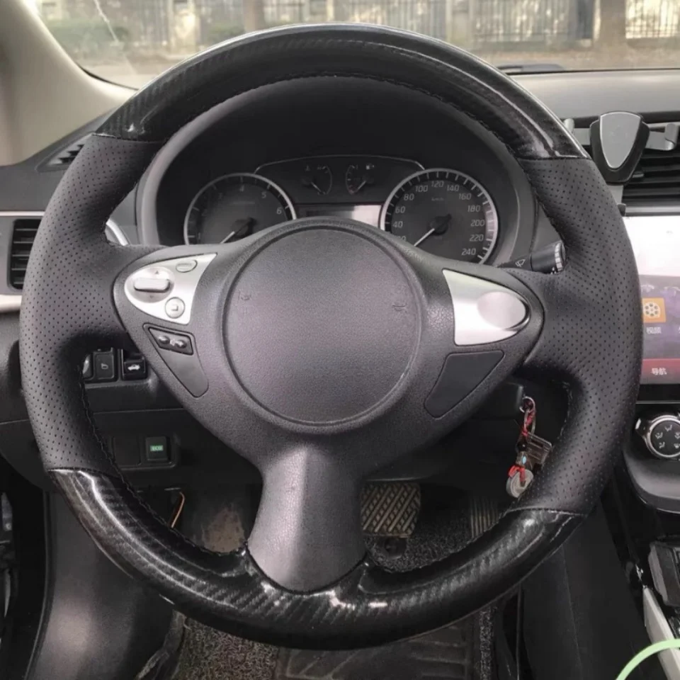 La funda de cuero genuino para volante de coche, cubierta de fibra de carbono es un accesorio de lujo que transformará el aspecto y la funcionalidad de tu volante. Este producto está diseñado específicamente para Infiniti FX FX35 FX37 FX50 Nissan Juke Maxima 2009-2014 Sentra, asegurando una compatibilidad perfecta con tus vehículos.