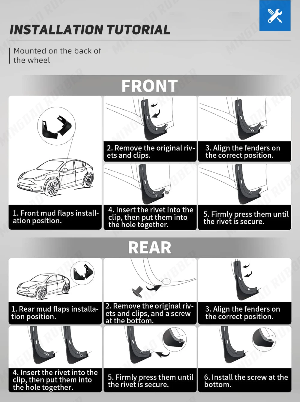 Nota especial: Fender es un accesorio adicional, no un accesorio original para el automóvil. Se pueden instalar directamente más del 90% de los modelos. Es posible que haya algunos automóviles que necesiten perforar agujeros e instalarlos usted mismo. Tenga la seguridad de que esto no dañará su automóvil.