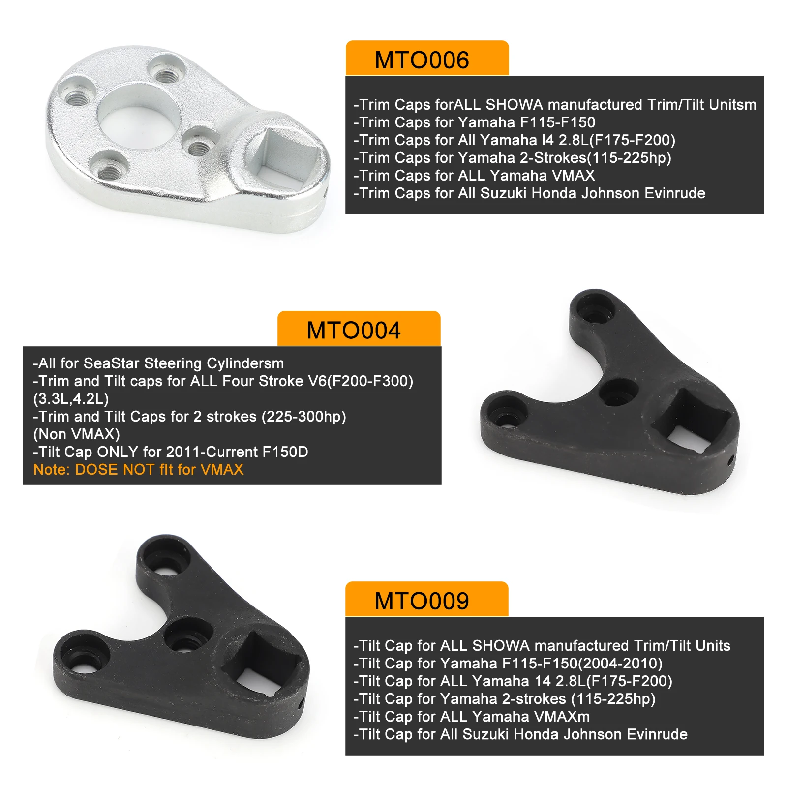 Montaje: Tapas de recorte para TODOS SHOWA fabricados Unidades Trim/Inclinación, Tapas de garantía para Yamaha F115-F150/para TODOS Yamaha I4 2.8L (F175-F200), Tampas de aparamento para Yamaha 2 tiempos (115-225hp)/para TODOS Yamaha VMAX, Gorras de garantía para Todos Suzuki Honda Johnson Evinrude