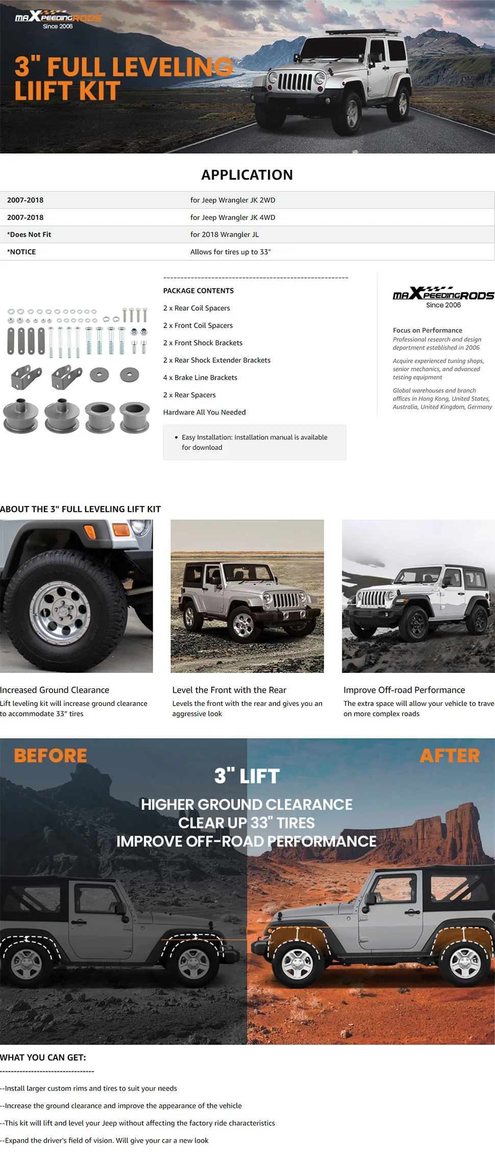 Presentamos el kit de elevación completo de 3 pulgadas para Jeep Wrangler JK 2007-2018, diseñado para llevar tu vehículo al siguiente nivel. Este kit de nivelación delantera y trasera te permitirá aumentar la distancia al suelo, instalar neumáticos más grandes y darle ese aspecto agresivo que buscas para tus aventuras off-road.