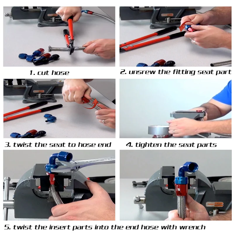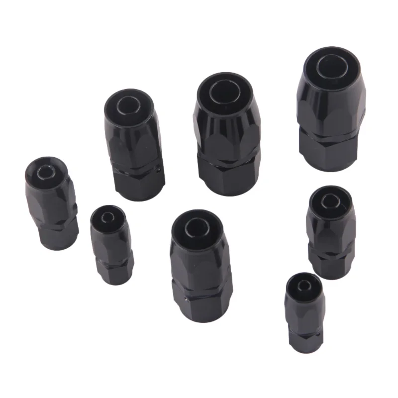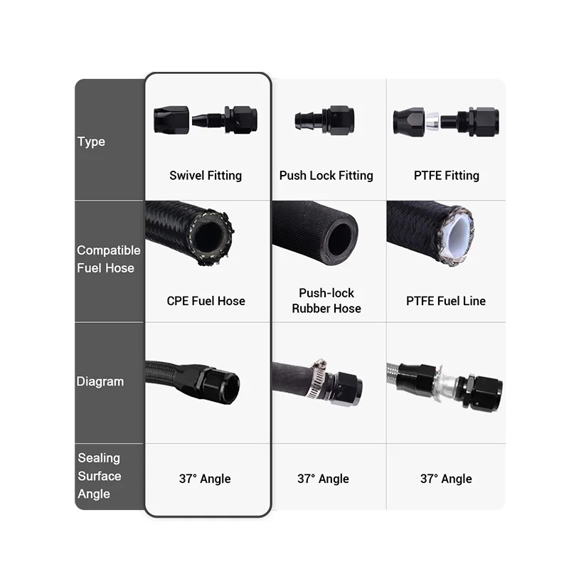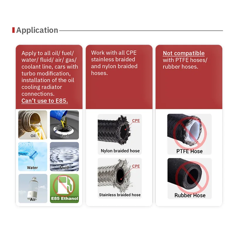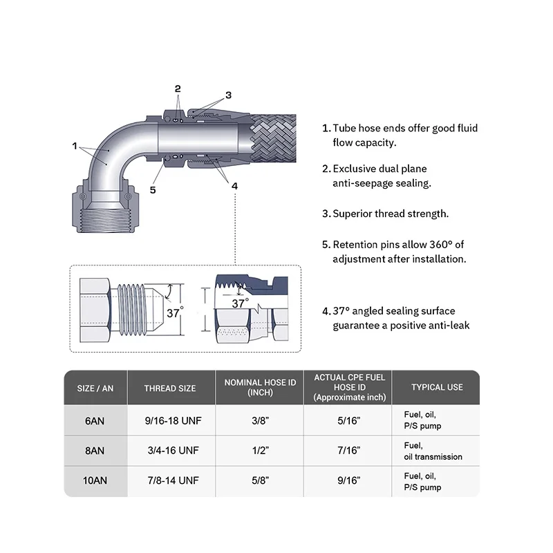 Disponible en tamaños AN6, AN8 y AN10, cada uno corresponde a un diámetro interior específico: 8,7 mm, 11,11 mm y 14,2 mm respectivamente. Es compatible con todo tipo de líneas de fluidos como aceite, combustible, agua o refrigerante, siempre que no sea E85. Funciona con mangueras trenzadas de acero inoxidable CPE y nylon.