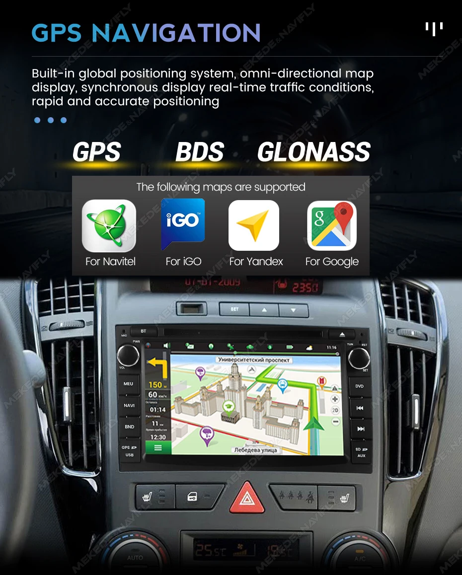 Sistema de posicionamiento global incorporado, visualización de mapas omnidireccional, visualización sincrónica de las condiciones del tráfico en tiempo real, posicionamiento rápido y preciso