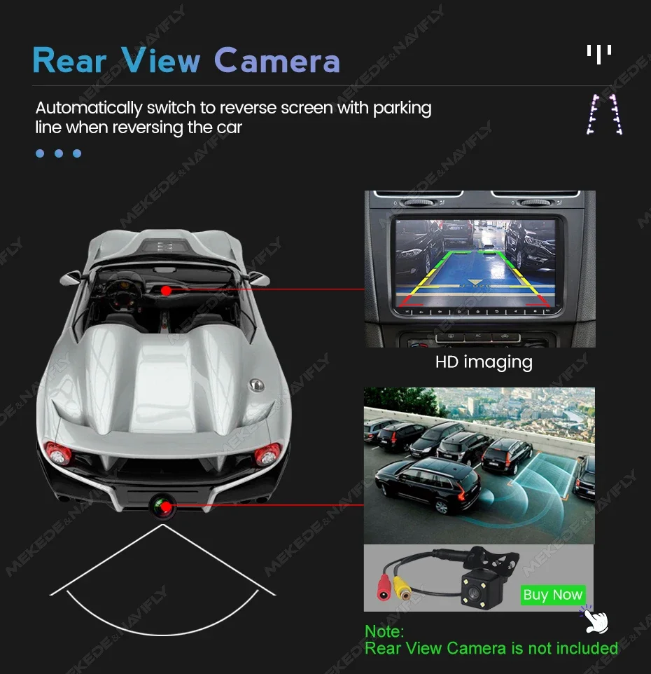 Cambie automáticamente a la pantalla de marcha atrás con una línea de estacionamiento al dar marcha atrás. La cámara no está incluida, es necesario comprarla sola