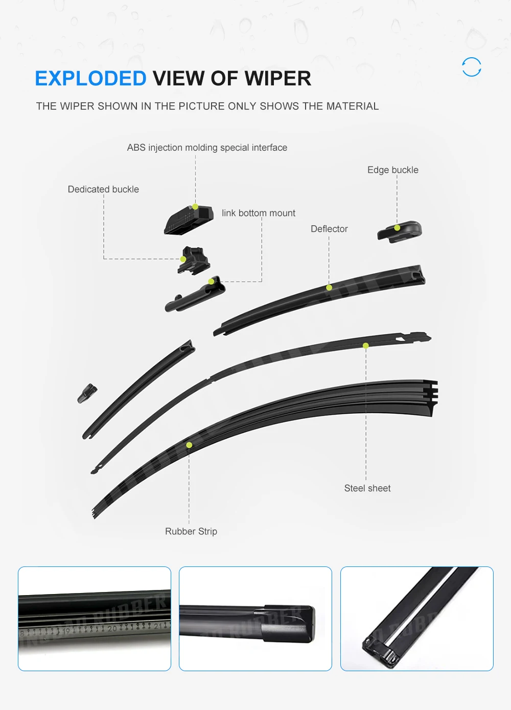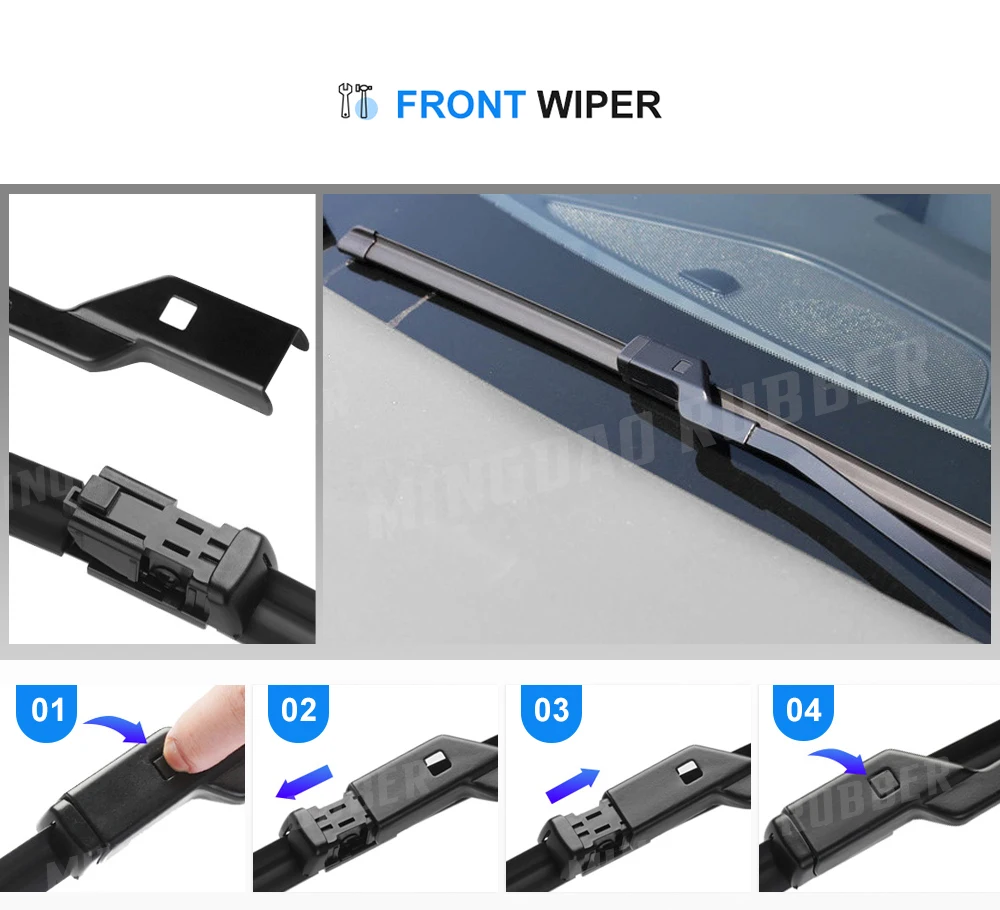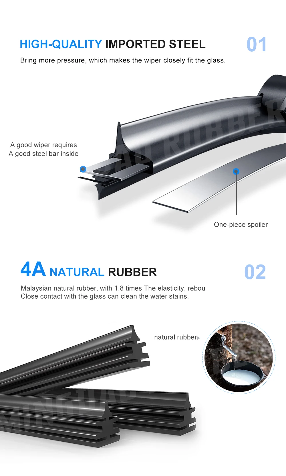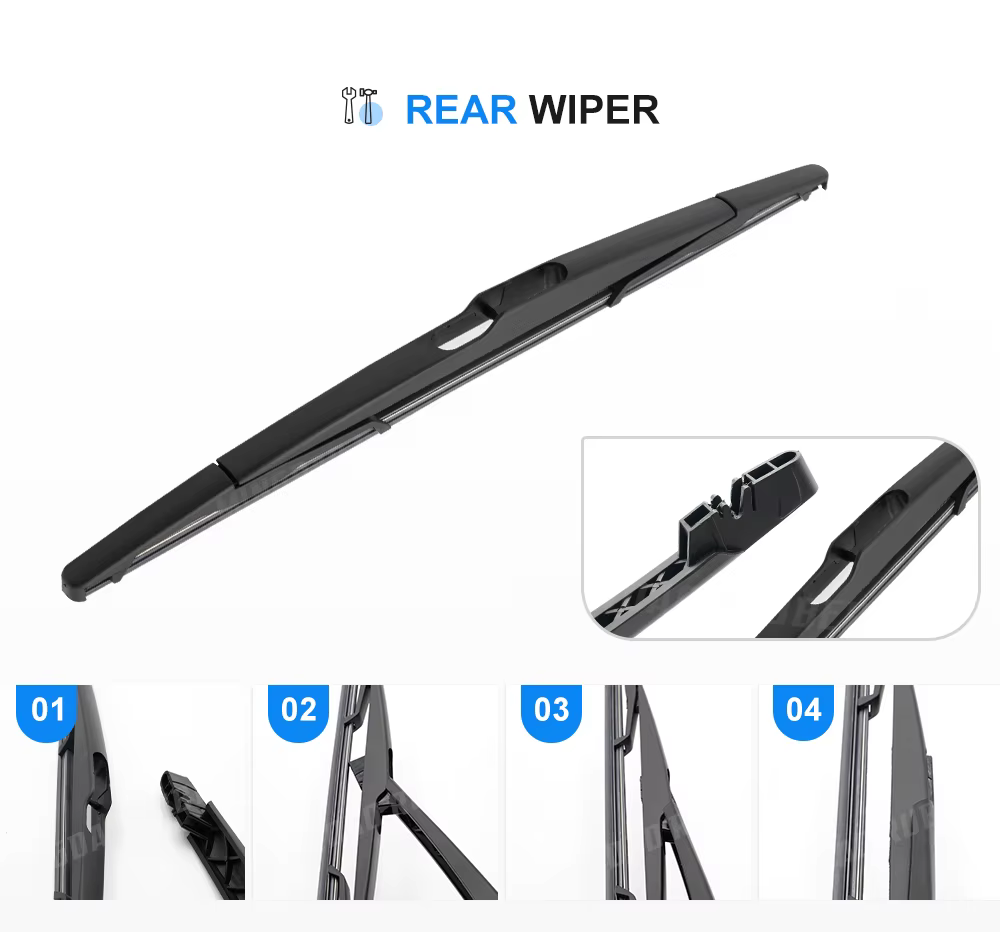4. Materiales: caucho natural 4A: hace que el limpiaparabrisas se ajuste perfectamente al vidrio. Barra de acero importada: presión precisa, para que el limpiaparabrisas y el vidrio encajen más estrechamente. La combinación de materiales de alta calidad permite que el limpiaparabrisas se fije estrechamente al cristal, brindándole una línea de visión más clara y garantizando la seguridad en la conducción.