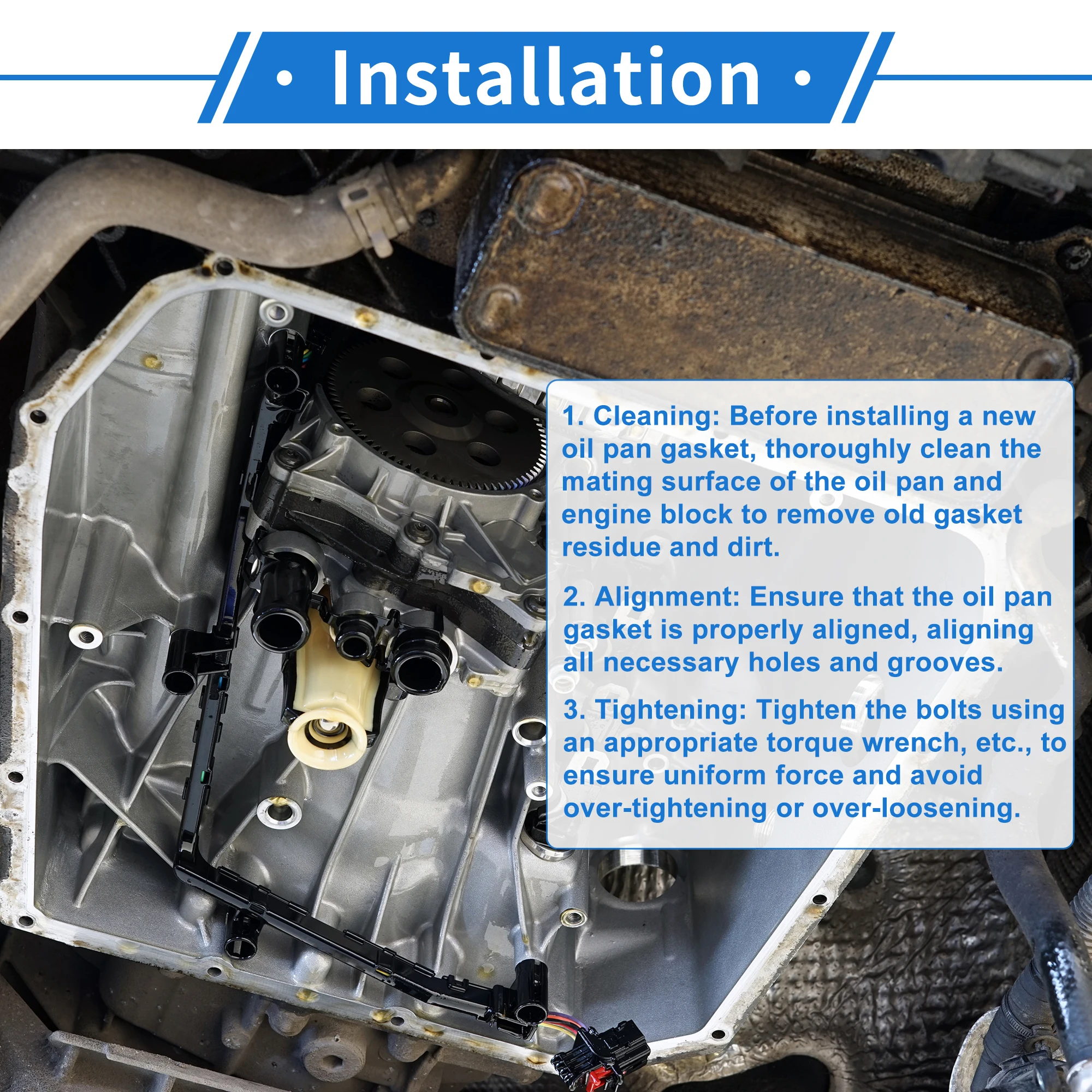 Antes de instalar una nueva junta de cárter de aceite, limpie a fondo las superficies correspondientes del cárter de aceite y el bloque del motor para eliminar los residuos y la suciedad de la junta vieja. Alinee y cubra todos los agujeros y ranuras necesarios. Aplique un lubricante apto antes de instalar la junta y apriete los pernos con una llave dinamométrica adecuada para asegurar una fuerza uniforme y evitar que se apriete demasiado o se afloje demasiado.